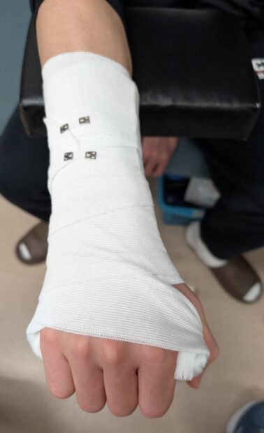 利き腕のため、使いやすさも考慮した固定をし、患部の安静を保ちます。